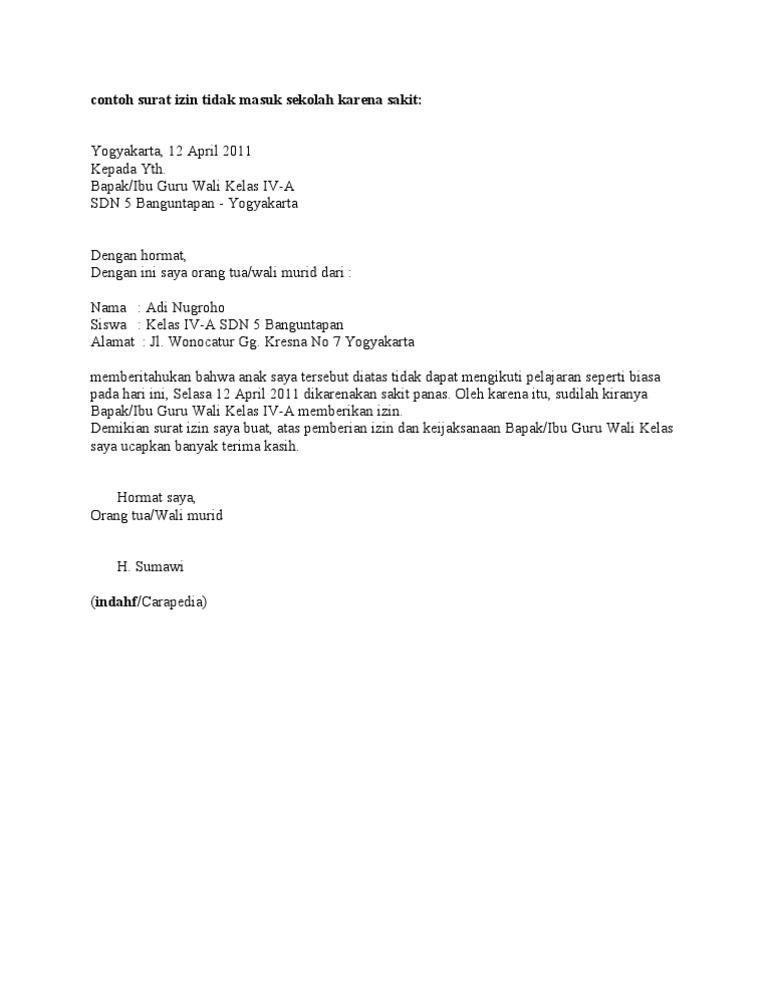 Namun tidak sedikit orang menyepelekan cara penulisan surat izin. Oleh karena itu, jika kalian sedang sakit dan tidak bisa mengikuti pelajaran yang ada di sekolah, kalian dapat mengirimkan surat izin kepada pihak sekolah yang bersangkutan. Bapak/ibu guru wali kelas 3a smp n 1 purwokerto. Hal ini tentu akan menyusahkan kamu ketika sakit, karena tidak ada orang tua untuk menandatangi surat izin. Terkadang seorang pelajar perlu meninggalkan kelas untuk beberapa jam sekolah guna menyelesaikan urusan tertentu.